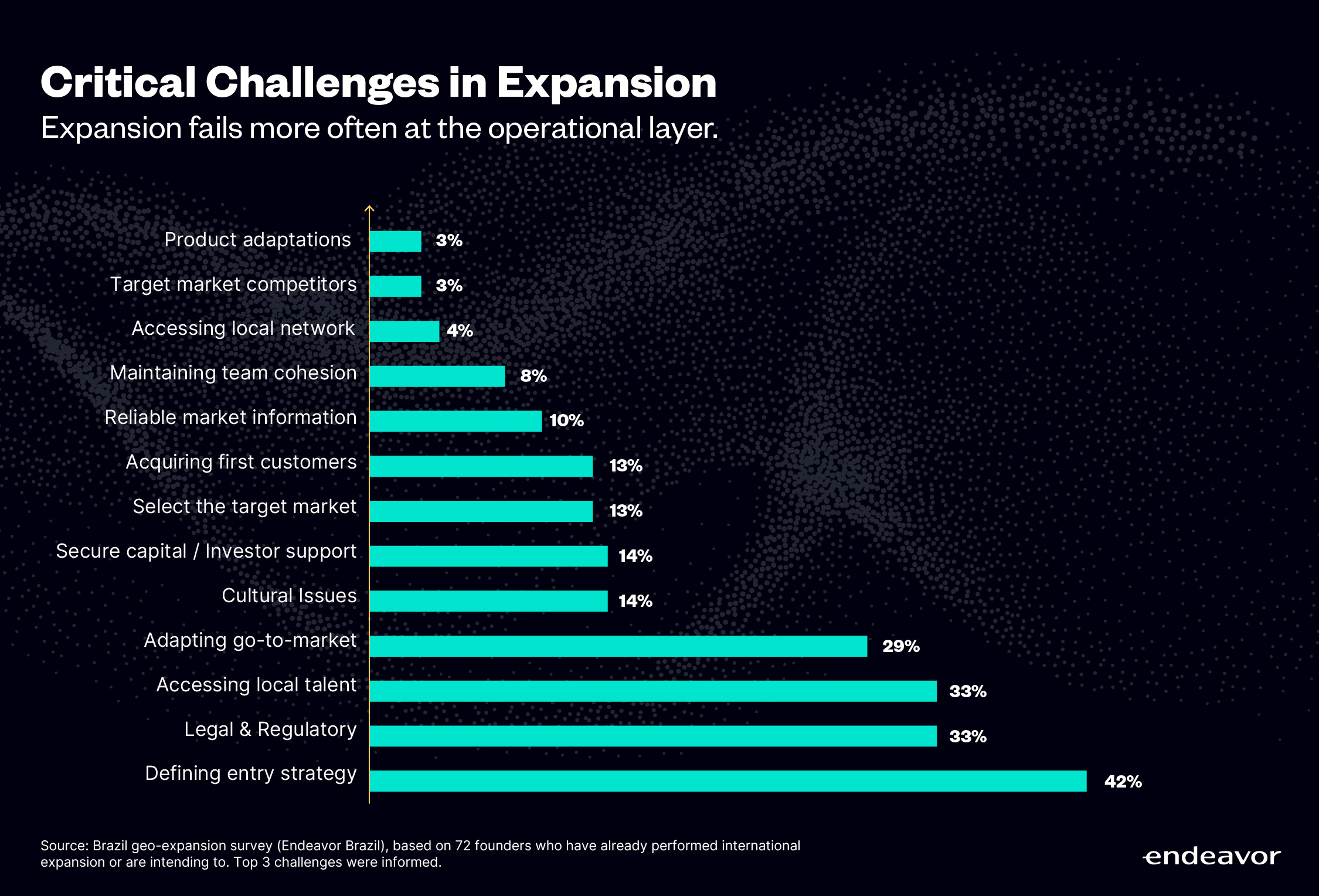 In the United States, the main challenges are related to integrating into the market: access to talent (52%) and go-to-market (48%). In Latin American markets, the same two challenges lead the list(35% and 46%, respectively). In Europe, the challenge landscape is more diversified, with go-to-market and regulatory requirements cited by 29% of founders. Regardless of location, entrepreneurs seeking to mitigate risks should avoid attempting to replicate their domestic scale straightforwardly. Building large, capital-intensive structures under the assumption that acceptance will transfer automatically often amplifies the risk of expansion rather than reducing it.