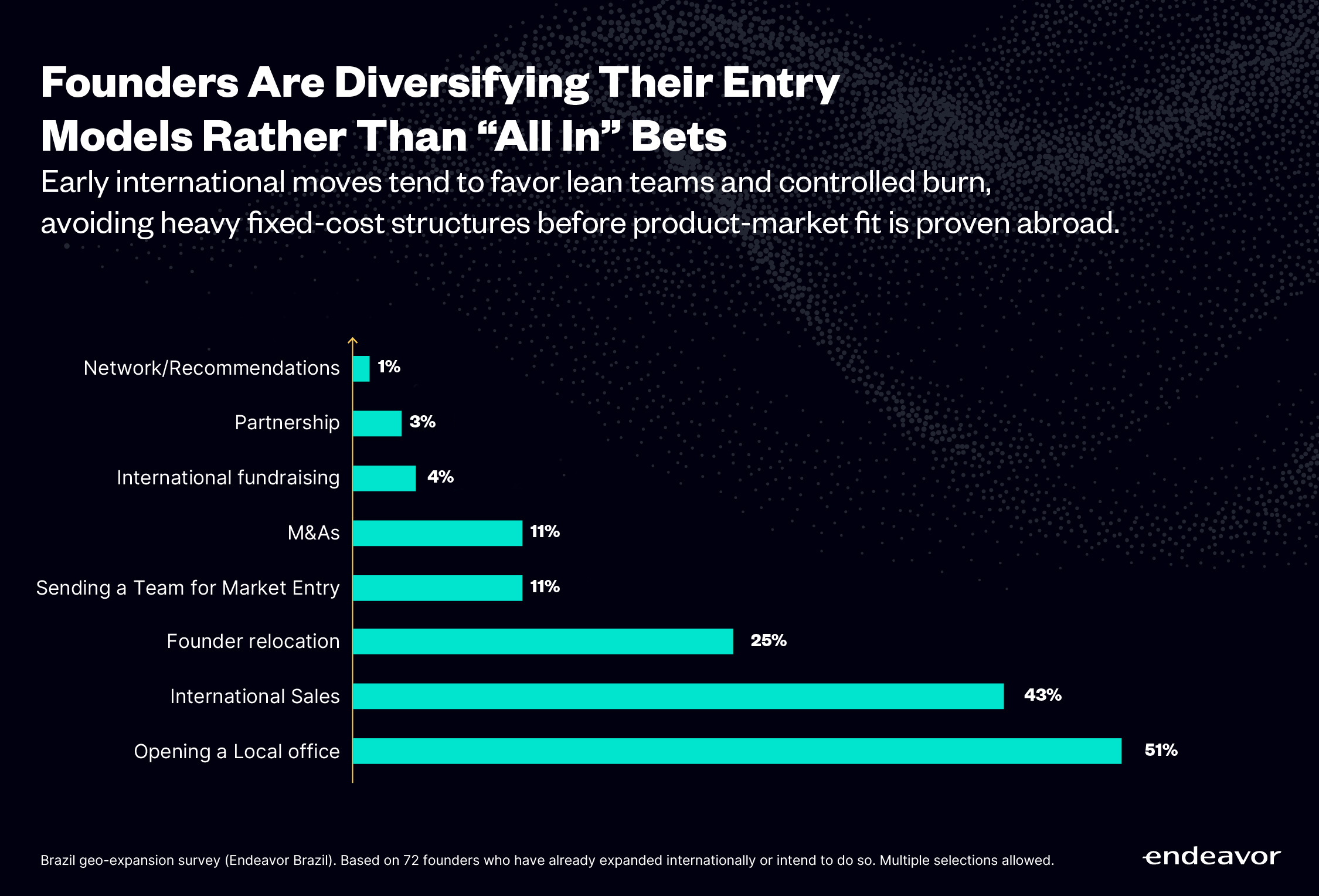 We identified at least 8 distinct entry paths used by Brazilian founders. The two most common are opening a local office, adopted by 51% of founders, and international sales, used by 43%.