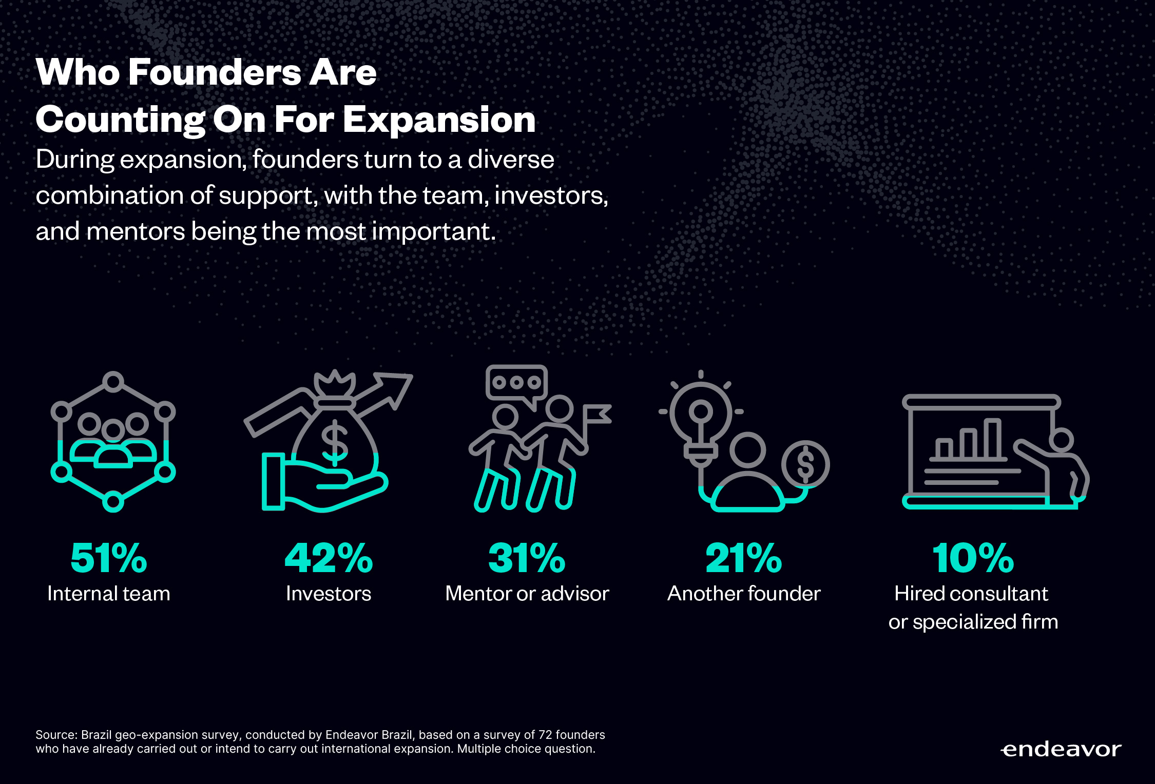 Founders in our survey consistently point to trusted relationships as a decisive factor: 68% have received external support during their expansion, while only 32% relied exclusively on their internal team.