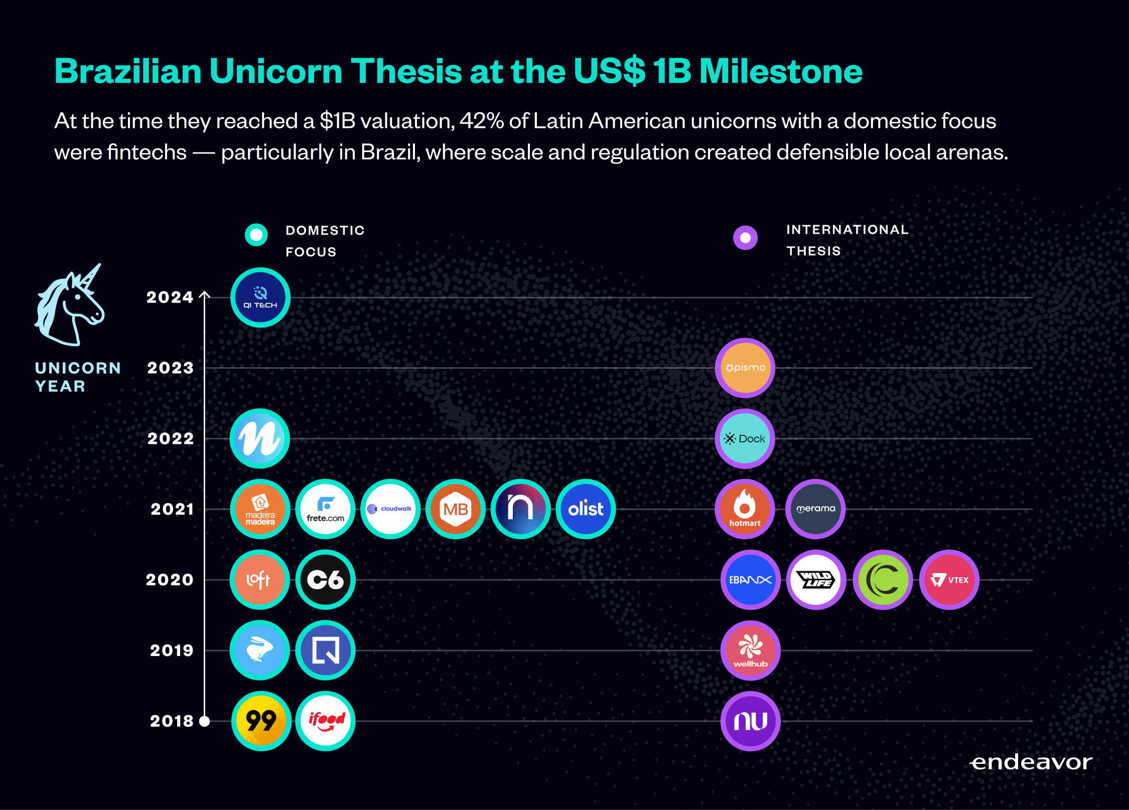 In parallel, we analyzed 50 unicorns — 25 from Brazil and 25 from across Latin America — assessing whether their core business thesis was predominantly domestic or inherently global at the time they reached a $1B valuation.